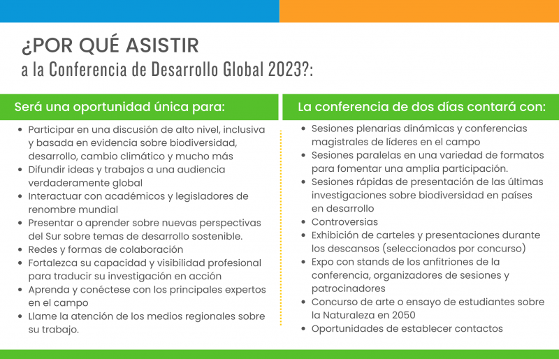 La Conferencia Global de Desarrollo 2023, que tuvo lugar del 31 de octubre al 1 de noviembre de 2023 en Quito, Ecuador, sobre el tema de la Biodiversidad y el Desarrollo Sostenible, reunió a expertos, investigadores y profesionales de diversos campos de todo el mundo para compartir sus conocimientos, experiencias y puntos de vista sobre las cuestiones cruciales de la biodiversidad y el desarrollo. Fue organizado por la Global Development Network en colaboración con la Universidad San Francisco de Quito (USFQ) y Future Earth en el campus universitario de la USFQ. Contó con el apoyo de la Agence Française de Développement; el Ministerio francés de Economía, Finanzas y Recuperación; la Fundación Hewlett; y el Banco Mundial.