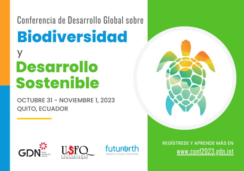 La Conferencia Global de Desarrollo 2023, que tuvo lugar del 31 de octubre al 1 de noviembre de 2023 en Quito, Ecuador, sobre el tema de la Biodiversidad y el Desarrollo Sostenible, reunió a expertos, investigadores y profesionales de diversos campos de todo el mundo para compartir sus conocimientos, experiencias y puntos de vista sobre las cuestiones cruciales de la biodiversidad y el desarrollo. Fue organizado por la Global Development Network en colaboración con la Universidad San Francisco de Quito (USFQ) y Future Earth en el campus universitario de la USFQ. Contó con el apoyo de la Agence Française de Développement; el Ministerio francés de Economía, Finanzas y Recuperación; la Fundación Hewlett; y el Banco Mundial.